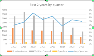 In the month of June we recorded 67 speeders. 56 received a 1st letter, 4 received a 2nd letter and 3 received a police visit because they'd already had 2 letters. 4 of the speeders could not be traced (we failed to correctly record the vehicle or its numberplate). Of the 63 confirmed speeders 87.5% were first timers and 12.5% were second or more. You could extrapolate that 87.5% don't speed again!