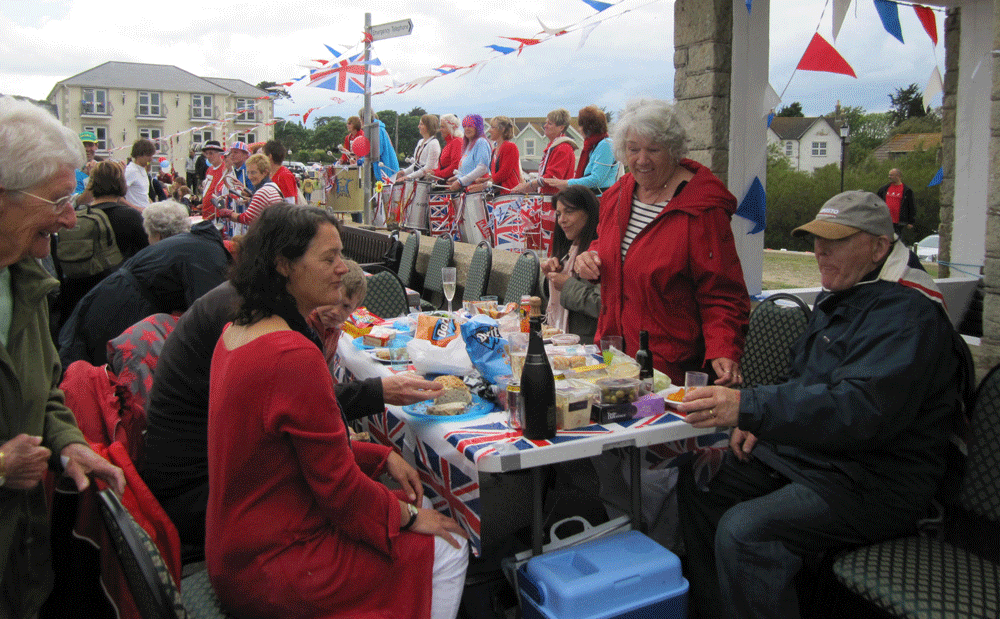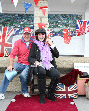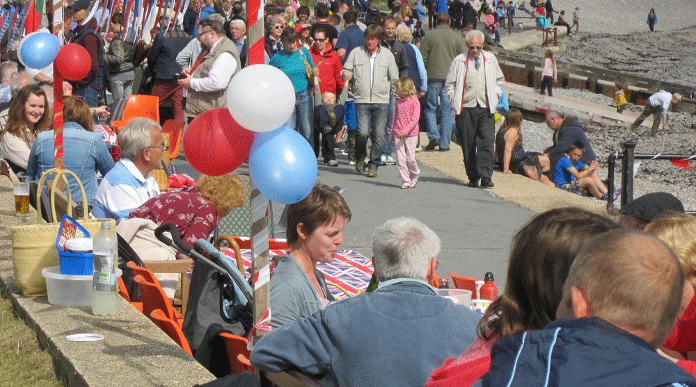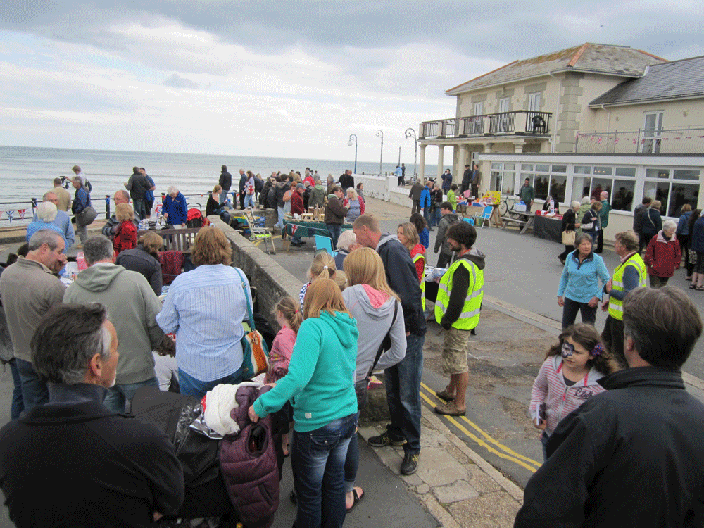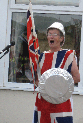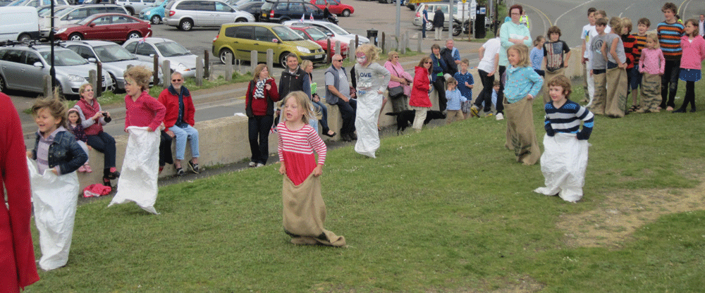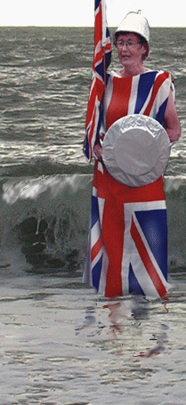 Despite the weather ( which was worse almost everywhere else!) hundreds turned up to join in races, games, and a sing-song which climaxed with Brittania singing Rule Brittania as she shed her regalia and plunged into the sea. This act of Great British Spirit, or lunacy, was mightily cheered by the assembled company. Later as dusk fell some gathered round the beach bonfire while a good crowd watched short films projected onto the cliffs. |