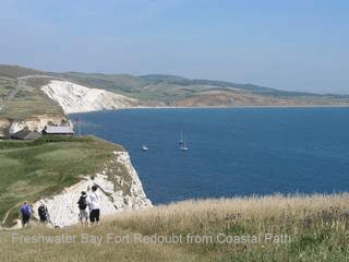 1855-56 saw the building of Fort Redoubt on the cliffs at the western end of the Bay. This was built in order to stop the French landing and attacking the other forts on the Solent side of the Island.It is not open to the public but the main layout can still be observed from above on the Downs. A deep, brick lined ditch was cut to the north and west in order tostop an attack from the land. Inside the ditch was a barrack block designed to house 24 soldiers. On the top of the newly created island was a parade ground and a one story flat roofed building. This was made into two stories in 1936 as quarters for the officers and NCOs. Extensive tunnels and rooms were built under the chalk of the cliff so as to be safe from mortars.