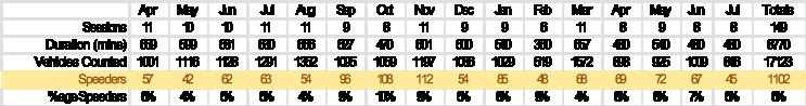 In the 16 months since we started we have run 149 SpeedWatch monitoring sessions and checked the speeds of 17,123 vehicles of which 1,102 (6%) were recorded as speeders. A speeder is 10% + 2 = 35 in a 30 zone, 24 in a 20 and 46 in a 40.