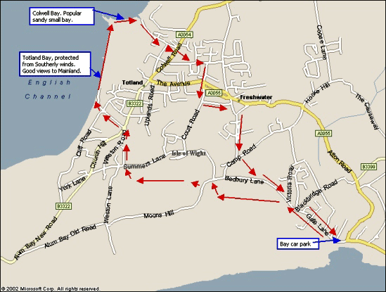 Local Walks from Freshwater Bay car park Lasting from 2 to 3 hours These start and end at the Freshwater Bay Car Park. Mainly designed for a half day trip out and we have tried to construct them so they are resonably flat! Walk 4. This walk takes you across to the other side of the Island to Totland and Colwell Bay. In a strong Southerly wind that side offers more shelter.