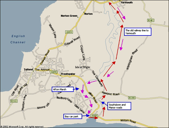 ![]() From the car park, turn right and follow Gate lane as it passes the toilets, Dimbola Lodge and the thatched St Agnes church. Carry on until you are opposite to the Freshwater Bay Post Office. Here you should find a footpath (F47) going left through the trees. Follow this path or lane and keep going under the old wooden footbridge at the back of the Farringford. This was the bridge used by Alfred, Lord Tennyson when he wanted to walk the Downs. Follow the path onwards until it comes to Farringford Farm. Here, turn right and go down to Bedbury Lane. Taking care, cross the road and turn left so as to cross Queens Road. Follow what has become Moon Hill Road a little further, crossing the Middleton road, until you approach a bend with a thatched cottage ahead of you. Before you reach this there is a footpath going off to the right. It is also a access way for some houses further along, so has a tram line of concrete along it. Follow this past fields and small farms until you come to a farm entrance. You will see directly ahead a stile into a field with a copse of trees ahead. Cross the stile and head for the trees. Here is another stile that leads into the copse. Go through the copse to a stile on the other side and then across the field. This brings you to a swing gate onto Summers Lane. Turn left by the Catholic graveyard and cross the road. Another footpath takes you down the side of one field to a point where it joins another. Turn left and go downwards to Weston Road. Here, turn right and proceed down to the small round about. The war memorial is on your left and just beyond that is Madeira Road. Follow this down to the waterfront. Totland pier runs out in front of you with some toilets on the left. By turning right you can follow a path along the top of the sea wall. This goes right around to Colwell Bay. There are good views all along of Hurst Narrows. Colwell is a popular small beach with a range of seaside stalls selling all the usual items. There is also a couple of cafes and some more toilets by the car park. The road leading down to Colwell Bay is Colwell Bay Chine, so turn right and follow this up to main Colwell Road. Nearly opposite is the Colwell Inn and to the right of this pub, a pathway. Go along this until it reaches the back of Freshwater village. At the end of the path turn left down Silcombe Lane and then right into Princess Road. This will take you to the top of the Avenue, which is the main row of shops in Freshwater. You have a choice, either turn left and go down the Avenue until the road turns right. At that point go straight on, across the small road island and up the side of Lloyds bank, into Queens Road. Otherwise, go straight across from Princess Road and follow Court Road until Clayton Road comes in from the right. This is a quieter route but the distances are the same. Take Clayton Road on the left down until this reaches Queens Road. Follow Queens road along the row of horse chestnut trees until you come to Pound Green, a delightful green with some interesting houses and cottages. The old pound into which stray animals were places, still can be seen on the right. When you approach the green, Queens Road goes off to the right but directly ahead, across Camp Road is a small path. Go up this to a field known as Granny's Mead. Cross this and on the far side is the Farringford Hotel. Turn left into Bedbury Lane and follow this down to Orchards shop and the junction with Victoria road. Cross the junction and take the road ahead, Gate lane, past the thatched church and on down to the Bay. This is a very poular walk and again goes from one side of the Island to the other. This follows the line of Afton Marsh and the Western Yar river to Yarmouth but is repeated a lot on the way back. ![]() From the Bay car park, turn left and proceed across Afton Roadand up the Military Road. There are a couple of small roads on the left but at the Plot, Southdown Road goes off to the left and is marked as leading to the Freshwater Golf Club. Take the road left and follow Southdown Road until it reaches a junction with Manor Road. Turn right and follow Manor Road until it meets the Newport Road. Almost opposite is The Causeway, a small road that leads down to the barrier above the top end of the Western Yar. At the barrier a path goes off to the right, between the river and na small cottage. This is the old railway line that runs down to Yarmouth. Follow this path along the river bank and finally, through the gate and down to the Mill. The path carries on along the river bank and around the car park. Where it rises onto the road a Yarmouth bridge, cross the road and head towards the quay. Yarmouth gets very busy in the summer months but is well worth a visit. There are some good pubs there and the quay is always a place to give entertainment. There is a castle and the only wooden pier still in commercial use, though this is only occasionally. Follow the path alongside the river back to the barrier at Freshwater. This time go straight across and follow the path until it reaches Afton Road, close to the End of the Line Cafe. Cross Afton Road and go slightly left towards the entrance to Afton Marsh. Follow the trail through Afton Marsh and over the small bridge where the stream divides. This will bring you to Blackbridge Road. Turn right and go along the road for a short distance and you should come to the entrance to the path that follows the rest of the marsh down to the Bay. Turn left onto this path and follow it until it reaches Coastguard Lane. Proceed down the lane, past the back entrance to the Sandpipers Hotel and onto Gate Lane, opposite to the Albion Hotel. The car park is on the left. See the Picture Gallery for sample views. The pictures in the gallery have been reduced in quality in order to speed up the site but we hope that they give some sort of idea of the views that you will see on these walks. |